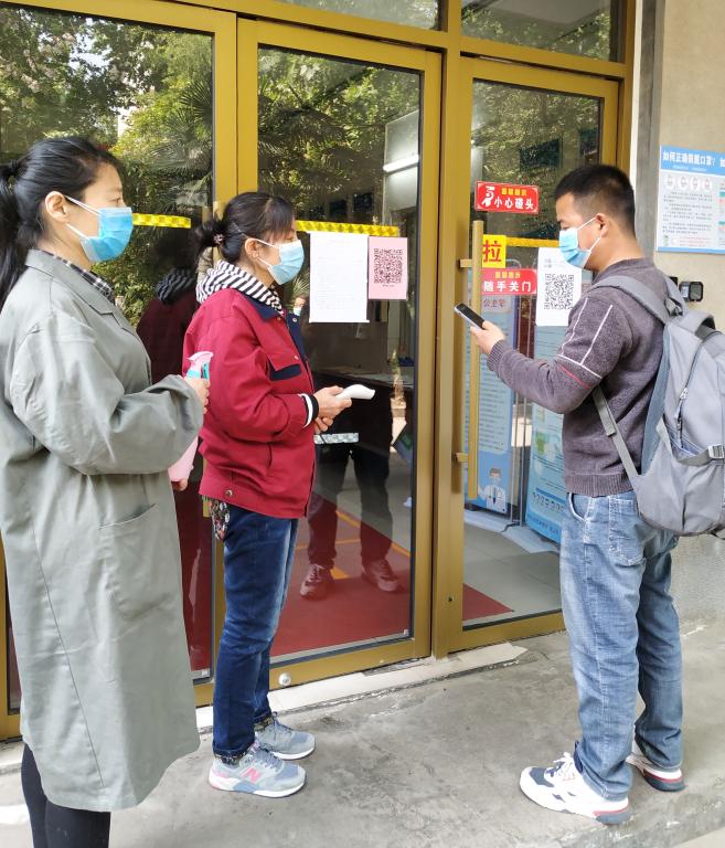 学生入住的明伦校区研一公寓和学二公寓,实地查看身份核实、体温检测、扫码登记等相关工作。
