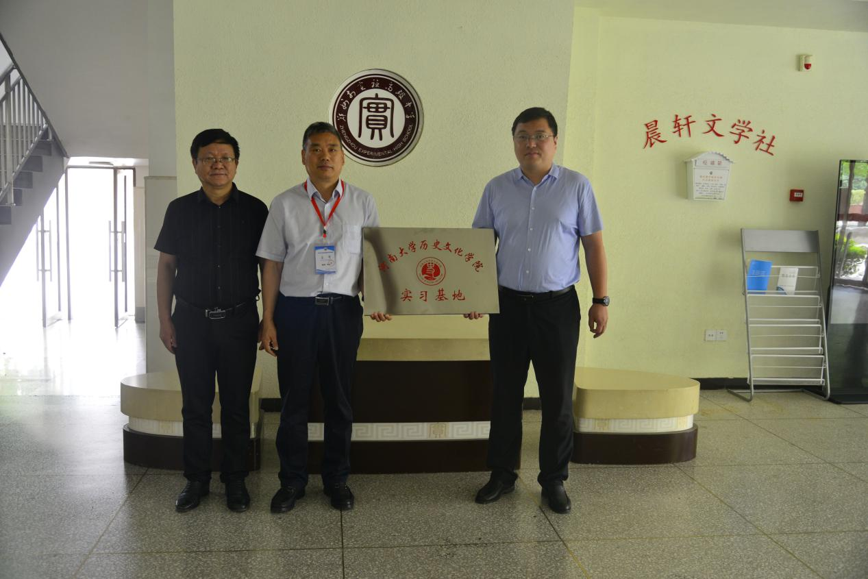 与郑州市实验高级中学实习基地揭牌仪式在郑州市实验高级中学举行,郑州市实验高级中学校长孙海峰、学院党委副书记周文凯、副教授邱胜利出席仪式。