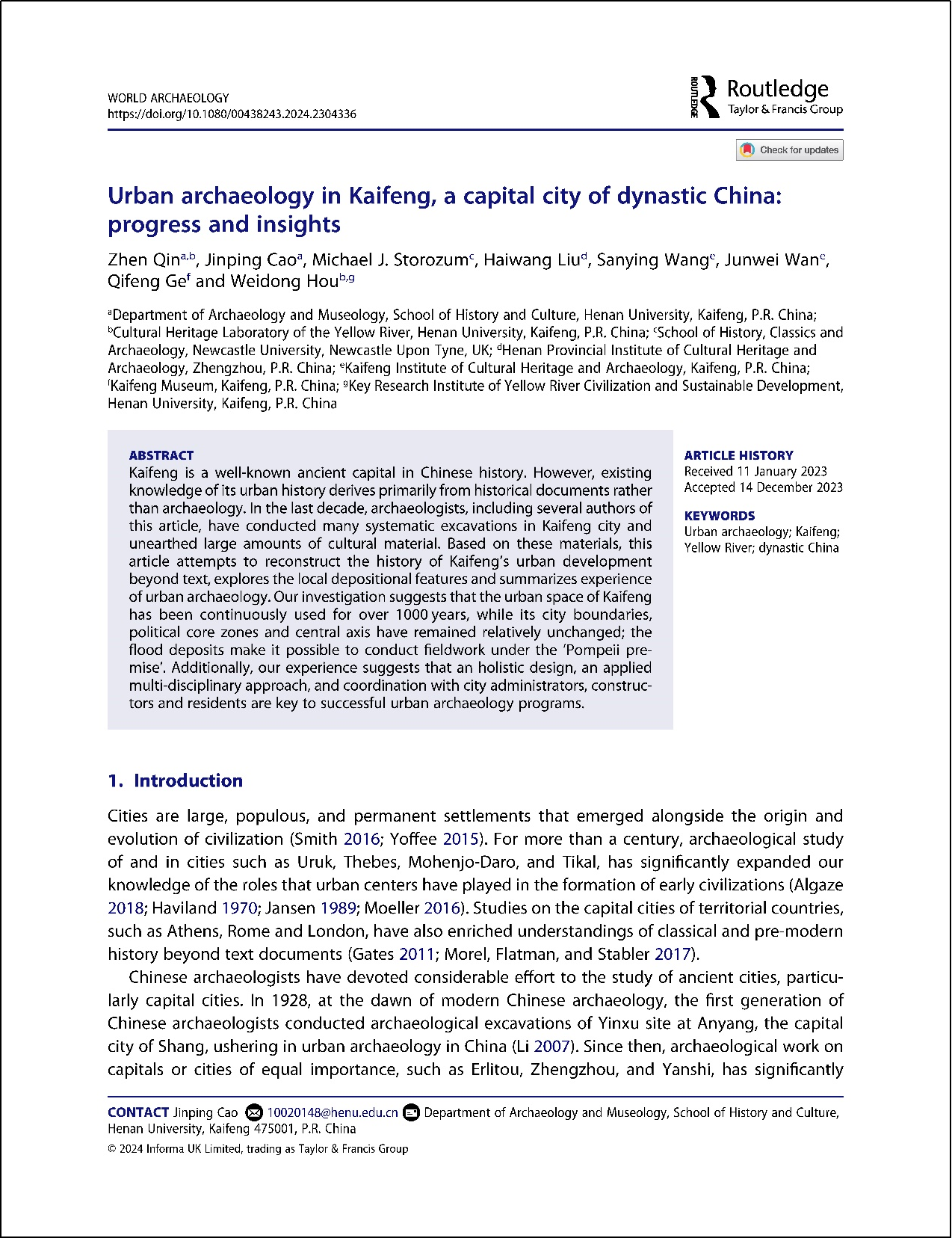 教师秦臻、曹金萍与校内外多位研究者合作,在国际知名考古学期刊《World Archaeology》(世界考古学)发表题为《Urban archaeology in Kaifeng, a capital city of dynastic China: progress and insights》(中国古代都城开封的城市考古:进展与认识)的研究论文。