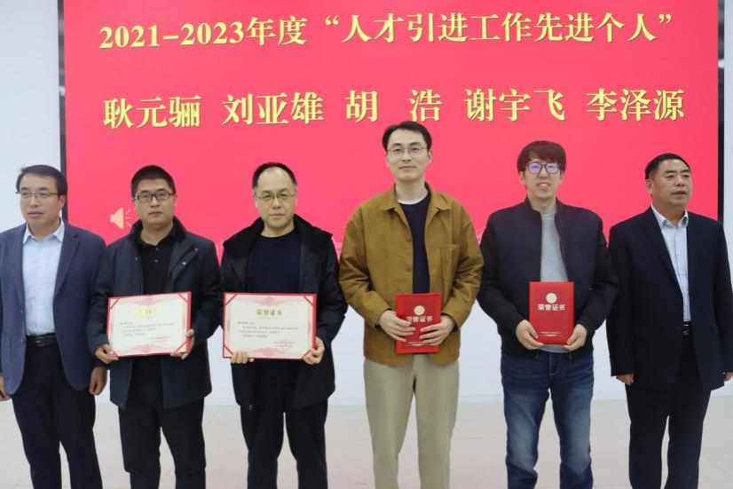 关于表彰2021年—2023年人才引进工作先进个人的决定》文件,受表彰教师依次上台领奖。