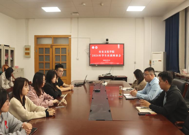 在学院二楼古代史教研室召开2024年学生社团座谈会,学院党委副书记周文凯、团委副书记贾茜贝和各社团负责人参会。会议由贾茜贝主持。