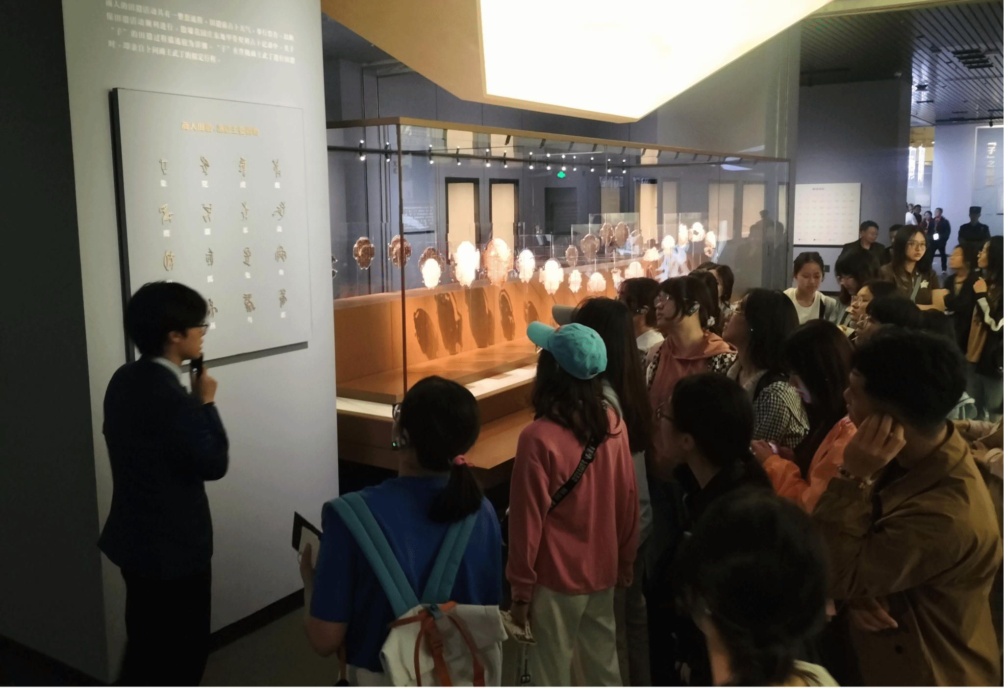 5月7日下午,考古学、文物与博物馆学专业师生抵达殷墟博物馆,该馆聚焦“伟大的商文明”这一主题,展出青铜器、陶器、玉器、甲骨等文物近4000件(套),展陈文物数量庞大、类型多样,从商代史、甲骨学、考古史、商文明的世界传播等多个角度,全方位阐释商代繁盛的城市文明、完善的礼乐文明、发达的青铜文明、灿烂的文字文明以及高超的手工业技术等,生动呈现了商文明对于中华文明乃至人类文明发展史上的重要地位和作用。作为中国考古学的圣地和摇篮,距今3300多年的殷墟留下了迄今为止所知最早的文字系统和文献,是我国历史上第一个文献可考、为考古发掘所证实的商代晚期都城遗址。考察队伍置身于博物馆中,切身地感受到先民的智慧,领悟到“伟大的商文明”这一主题的含义。