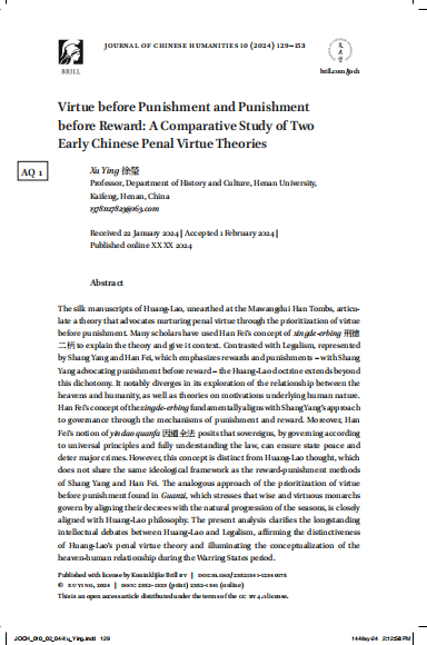 在发表于Journal of Chinese Humanities的Virtue Before Punishment and Punishment Before Reward: A Comparative Study of Two Early Chinese Penal Virtue Theories(《先德后刑与先刑后赏:两种早期刑德学说的比较》)一文中,徐莹教授认为马王堆汉墓出土的黄老帛书阐述了一种“先德后刑”的刑德相养理论,学者以韩非的“刑德二柄”加以解读,认为二者同义。法家讲赏罚,以商韩为代表。商鞅之学在这一问题上,主张“先刑而后赏”。虽然黄老的“先德后刑”与商鞅的“先刑后赏”有相通之处,但黄老刑德概念的内涵远大于刑赏,二者在天人关系、人性驱动论等方面,也具有本质区别。韩非的“刑德二柄”与商鞅的刑赏治术并无二致,“因道全法”也非黄老思想。黄老刑德与商韩的赏罚之术并非同一思想体系。而《管子》务时寄政的“先德后刑”之说则颇具黄老学的气质与特征。通过对“先德后刑”与“先刑后赏”这两种早期刑德学说的对比,可以清理黄老与法家之间旷日持久的思想纠葛、明确黄老刑德学说的思想独立性,并由此管窥战国时期的天人关系。