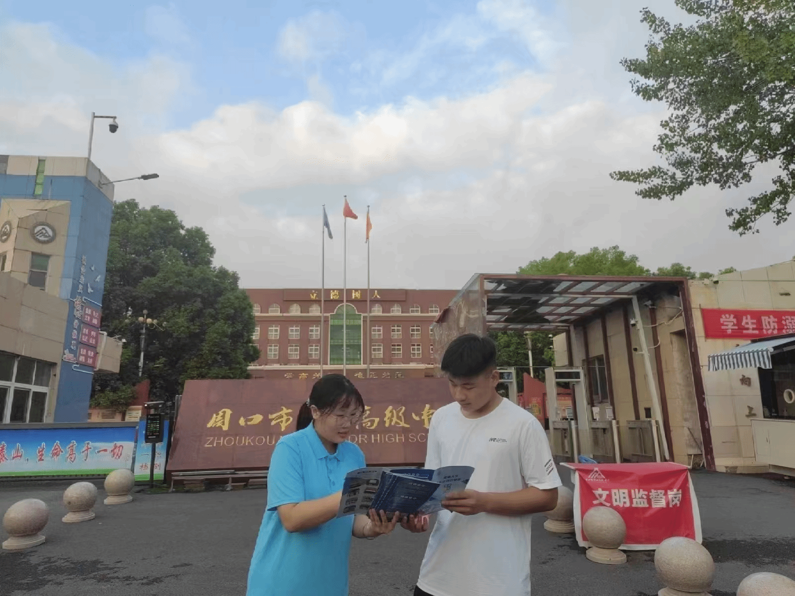7月26日资助工作站队长张芮同学在周口市第一高级中学校门前进行线下资助政策普及宣传,为即将步入大学校门的准大一新生详细讲解了国家奖助学金和我校的各项资助政策,并将部分宣传手册发放给需要的同学们,让学生和家长提前感受到了学校的关怀与温暖。