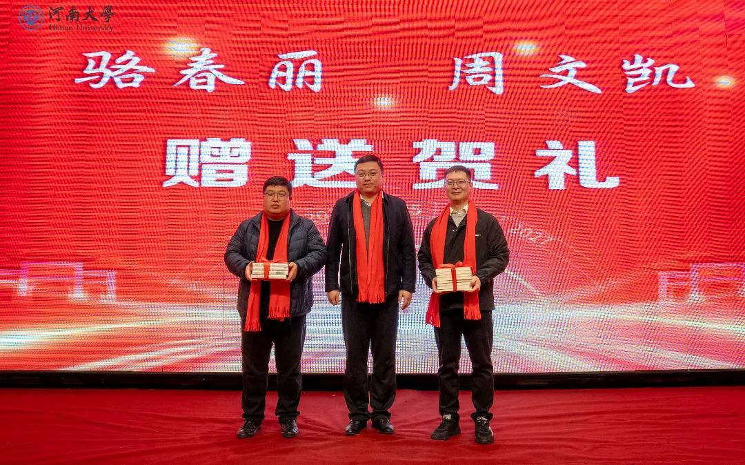 1984级毕业生赵耀荣向母校捐赠个人书画作品。洛阳市慈善艺术家吴大崴为参会人员送上亲笔书写的新春祝福。