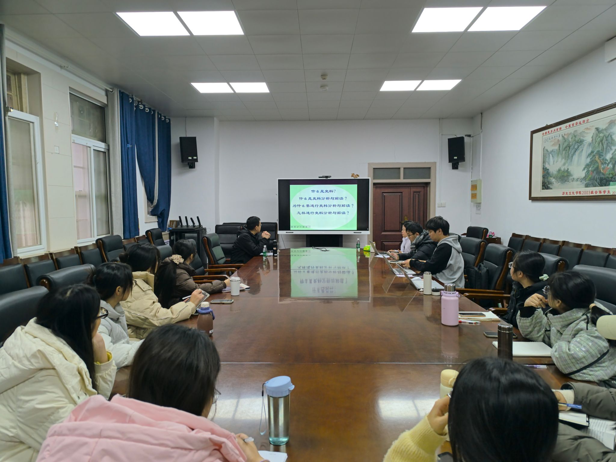 青年教师艾讯主讲,安瑞老师主持,2023级菁英班全体同学参与,共同学习史料分析的方法与路径。