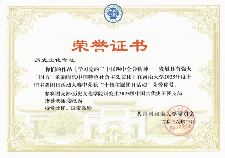 基层团组织建设的充分肯定。支部团支书王云珊表示,研究生2025级中国古代史班团支部将以此次获奖为契机,持续深化党的创新理论学习,把个人成长融入文化强国建设大局,在学术研究与社会实践中践行青年担当,助力基层团组织建设提质增效。