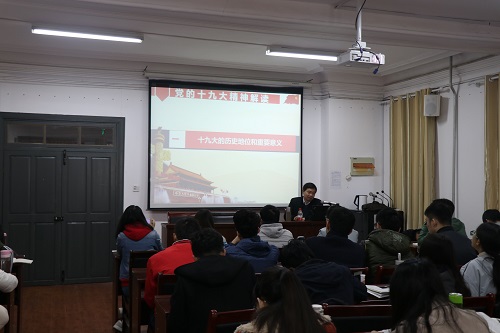 111教室为学院入党积极分子解读党的十九大精神,讲座由学院党委副书记杨光辉主持。