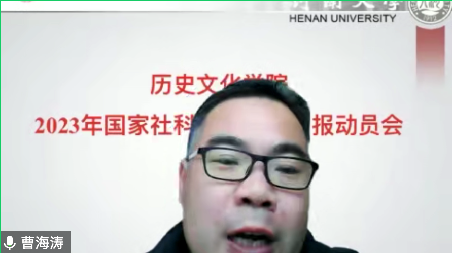 曹海涛对学院国家社科基金申报提出指导意见。他表示,国家社科基金项目关注度较高,对学校“双一流”建设、学院学科发展、教师个人成长都有重要意义。项目是学术研究的起点,学院和老师们要以项目为抓手,提升自己的科研能力,努力做出优秀成果。他结合自己从事项目管理工作的具体经验,详细介绍了国家社科基金项目申报流程、申报书的填写规范和申报中须注意的事项。