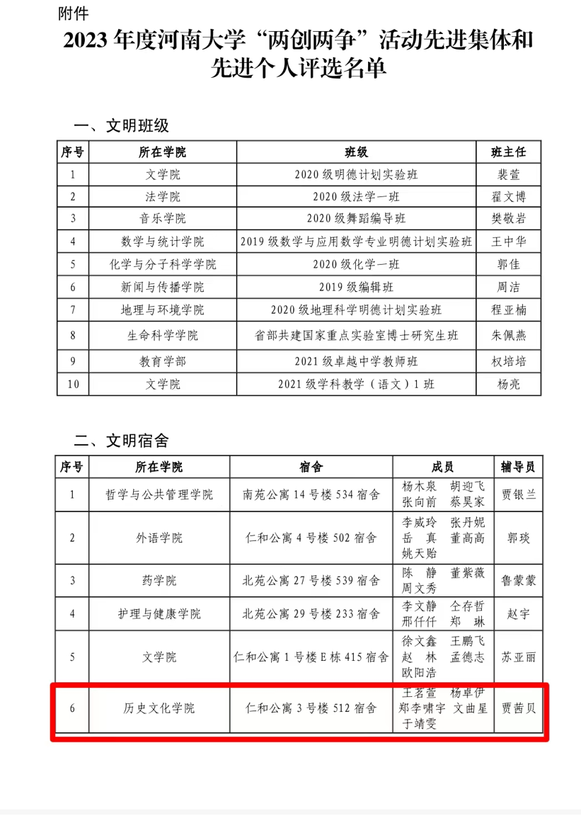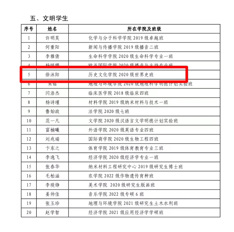 仁和公寓3号楼512宿舍被授予“文明宿舍”荣誉称号;宋韵诗书学社被授予“文明社团”荣誉称号;2020 级世界史专业徐沐阳被授予“文明学生”荣誉称号。