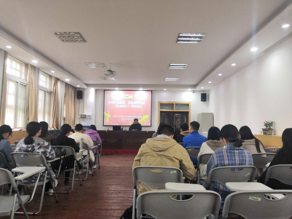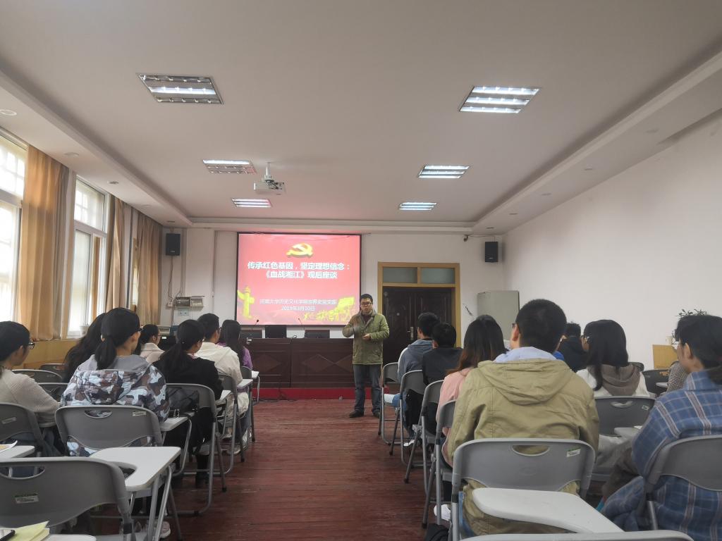 首先,历史文化学院世界史党支部书记李恒表示,时值两会,《血战湘江》再次得到委员们的热烈讨论,影片塑造了以毛泽东为代表的中国共产党领导人的光辉形象,生动再现了红军将士顾全大局、勇于牺牲,奋力掩护中央红军渡过湘江的英雄事迹,正是他们的牺牲,保留了革命的火种。影片正面表现了红军将士满怀对党的无限忠诚、对革命的坚定信念,希望支部的师生党员和入党积极分子把影片作为学习长征精神的生动教材;同时鼓励大家接过历史接力棒,走好新的长征路。
