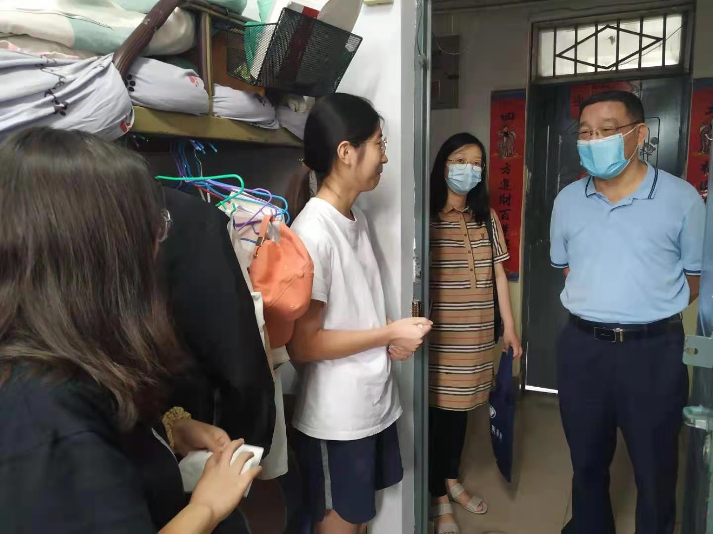 看望过程中,院领导与同学们进行了亲切交谈,询问了解同学们目前的学习生活情况,并对同学们在疫情防控特殊时期的良好表现给予表扬和肯定,同时要求同学们要严格遵守学校有关疫情防控规定,非必要不外出,特别是不要前往中高风险地区;合理安排学习计划,养成良好的生活作息习惯;同学之间要互帮互助,努力形成“在校如在家”的良好风貌。