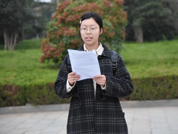 升旗仪式结束后,历史文化学院团委副书记郑振亚发言。他表示,国旗是新中国的象征,国歌是最激越的旋律,现如今幸福祥和的生活正是英雄前辈浴血奋战的结果。他强调,祖国取得的辉煌成就来之不易,作为河大学子,在中华民族伟大复兴的征程中,应当用实际行动书写当代大学生的正确价值观,为祖国的发展贡献青春力量。2020级世界史专业学生代表文曲星作国旗下演讲。她举出独龙族的实例,阐明了中国共产党始终秉持“一个民族都不能少”的原则,带领各少数民族不断发展迈向小康的初心,河大学子作为新时代青年,更应传承百折不挠、自强不息的精神,为实现中华民族的伟大复兴而拼搏奋斗。