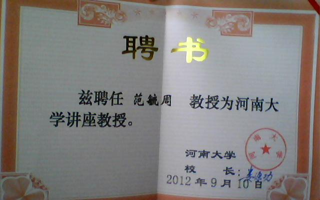我从欧美各个名校讲学和研究回国后,母校对我恩惠愈深。为了报答母校恩惠,我和原在河南大学任教多年后任河海大学校长的国家著名水利专家严凯教授在南京组织散在江苏各地的河南大学校友建立了南京校友会,由严凯教授任会长,我任副会长。后来严凯教授退休由我接任会长,开展了一系列校友联谊活动,母校校友总会给予多方支持和指导,使这个不足百人的校友会成为江苏校友与母校联系的纽带。我们先后组织校友参加了母校建校90周年和100周年校庆的活动。在此期间母校历史文化学院还聘我为兼职教授回母校做过多次学术报告,汇报自己在科研方面的收获。学校领导黄校长还亲自到南京大学看望我,并由学校娄源功校长亲自聘请我与我的老师夏商周断代工程首席科学家李学勤教授及中国社会科学院历史研究所副所长王震中教授、中国社会科学院考古研究所所长王巍教授同时担任学校的校聘“讲座教授”。在母校建校100周年校庆活动中,由我提议并参与组织历史文化学院专门举办的“纪念孙作云教授诞辰100周年国际学术研讨会”作为校庆重要活动。此后我受主持“协同创新”项目“黄河文明与可持续发展”的学校党委书记关爱和教授邀请参与该项目的顶层设计,还在西二斋为我设立了专门的办公室。在该项目进行过程中我参加了多次专门学术会议和活动外,还广泛邀请海外学者帮助母校组织了“黄河文明与古文字国际学术研讨会”。