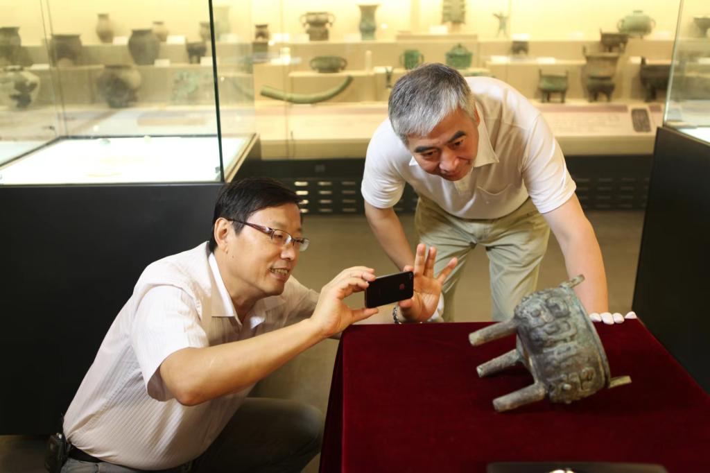 王巍(左一)拍摄琉璃河燕国贵族墓出土带有燕侯铭文的青铜器。受访者供图