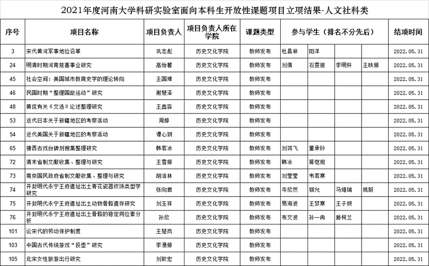 根据《河南大学科研实验室面向本科生开放性课题项目工作方案(2021年)》的要求,河南大学于2021年11月开展了科研实验室面向本科生开放性课题项目的申报工作。经过项目遴选和资格审查,历史文化学院获得立项16项,立项名单如下: