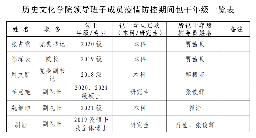 历史文化学院领导班子成员疫情防控期间包干年级一览表