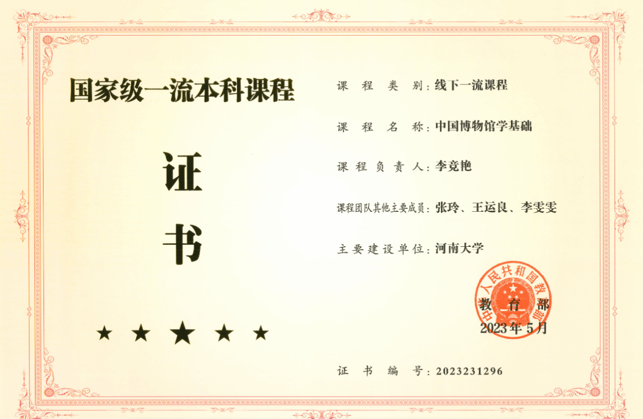 课程体系完备:课程体系涵盖文物学、博物馆学、历史学、考古学等模块。注重“金课”和实践基地建设,获批国家级、省级精品在线课程3门,省级以上实验教学平台2个。拥有河南大学文物馆和各类实践基地20余处。