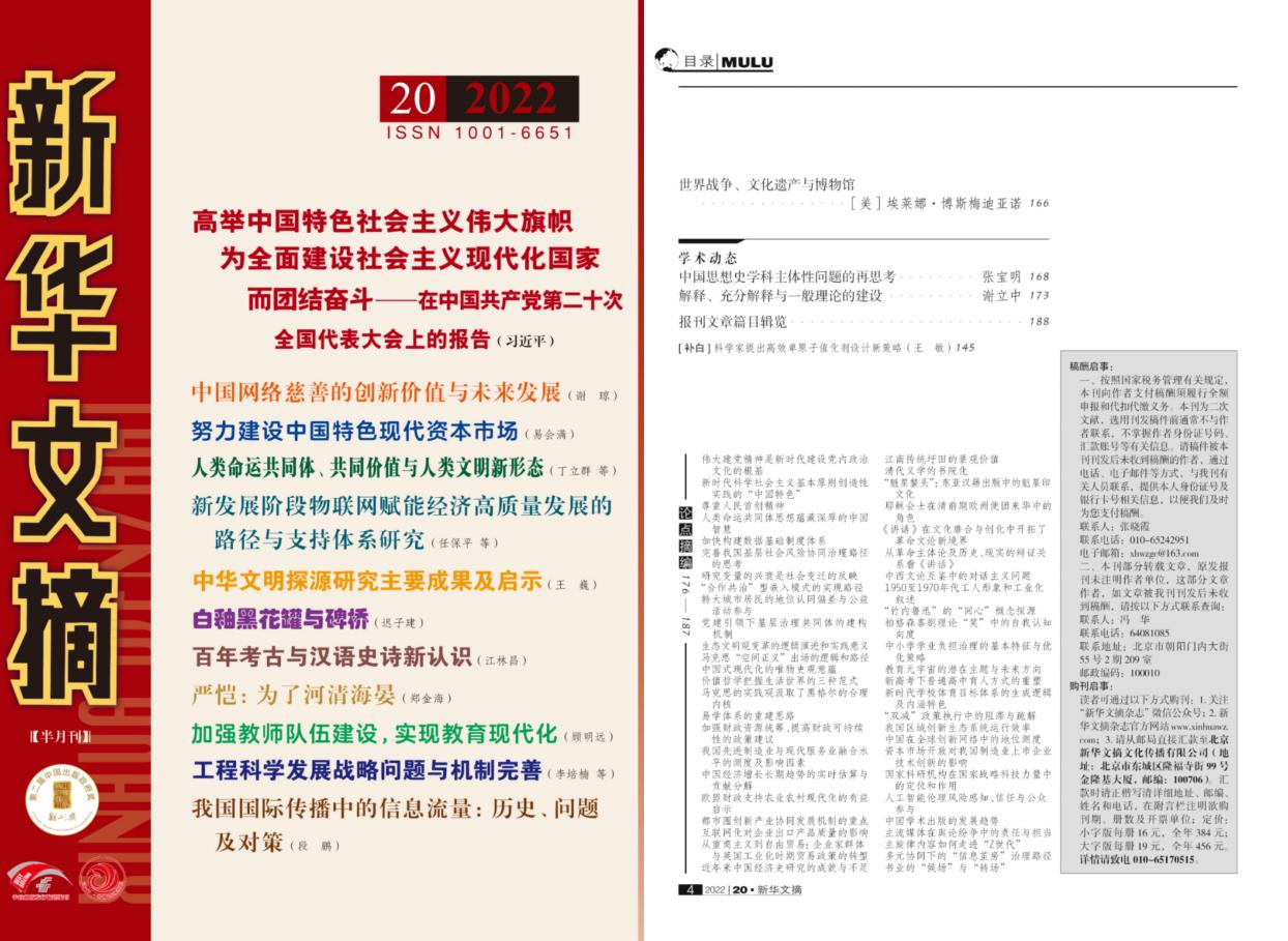 近日,河南大学历史文化学院特聘教授王巍的文章《中华文明探源研究主要成果及启示》和张宝明教授的文章《中国思想史学科主体性问题的再思考》,被《新华文摘》2022年第20期全文转载。