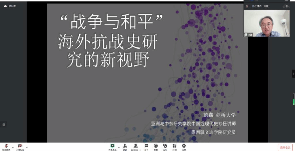 2023年6月29日晚,剑桥大学亚洲与中东研究学院院士、研究员范鑫受邀在历史文化学院做题为《“战争与和平”海外抗战史研究新视野》的线上讲座,本场讲座由河南大学历史文化学院柳岳武教授主持,河南大学历史文化学院贺怀锴副教授作为与谈人参加会议。