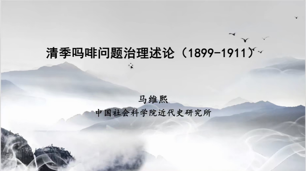 2023年12月23日晚上,中国社会科学院近代史研究所马维熙助理研究员受邀在河南大学历史文化学院做题为《清季吗啡问题治理论述(1899-1911)》的线上讲座。本场讲座由哈尔滨工业大学(深圳)马克思主义学院裴广强副教授主持,长江大学历史系陈力教授、河南大学历史文化学院副教授付燕鸿作为与谈人参加会议。