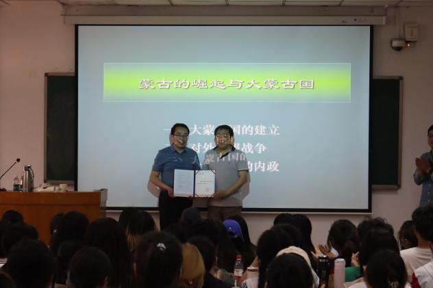5月10日下午,张帆教授走进历史文化学院本科生基础必修课《中国古代史》的课堂,在综合教学楼109教室为历史学一年级本科生以“蒙古崛起与大蒙古国”为题进行授课,这也是历史文化学院名家进课堂系列的第一讲。课前,河南大学历史文化学院祁琛云院长为张帆颁发“河南大学讲座教授”聘书。