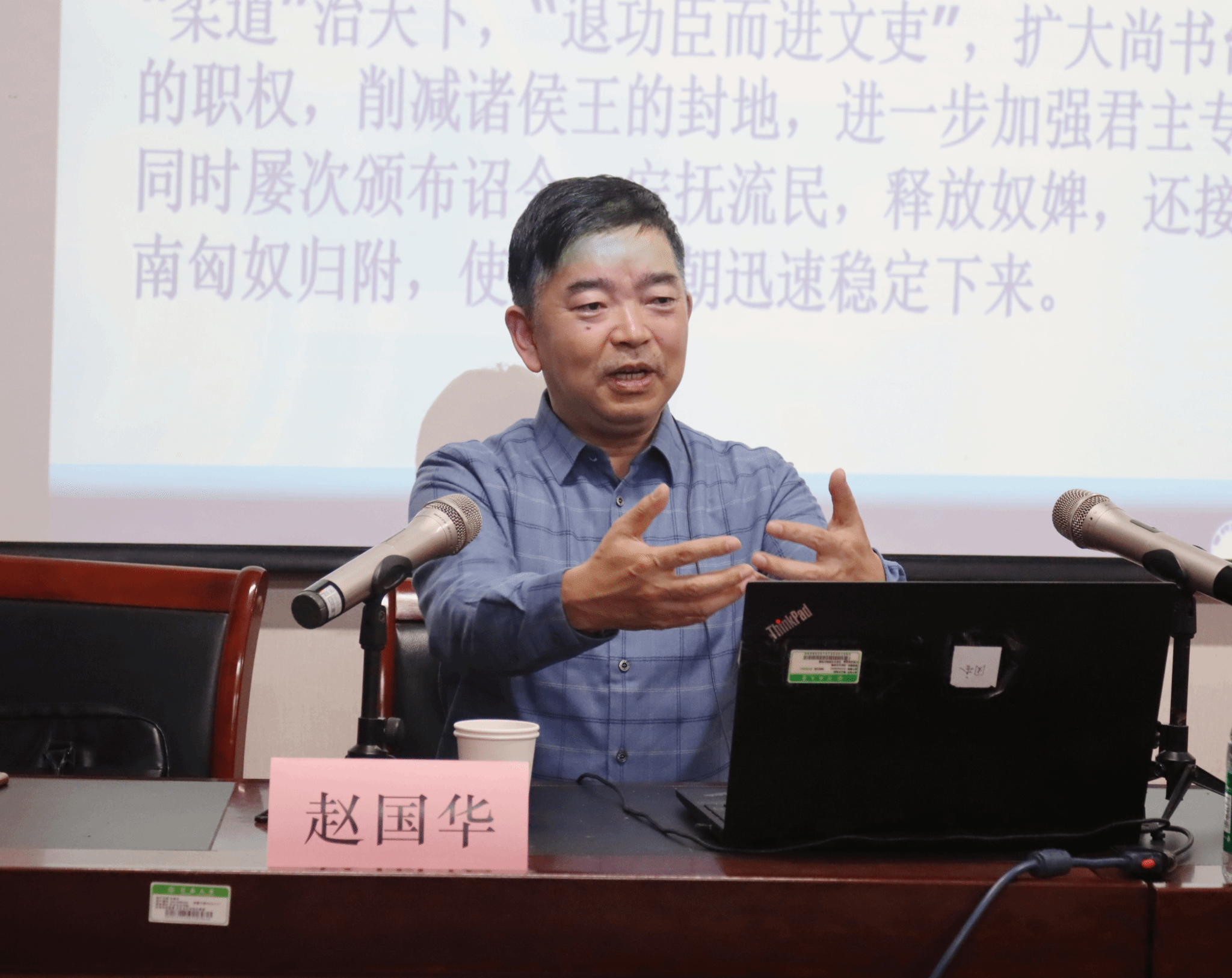 赵国华从其历史教学和研究的实践出发,阐述了研究历史问题所需具备的两项核心能力,一是将历史与现实相结合的能力,二是分析问题的能力。紧接着,赵国华谈道,当前学术界对东汉历史的关注度不足,研究亦不够全面。他强调,东汉史的时间跨度是25年至220年,而非仅限于中学历史教材所提及的黄巾起义为止。赵国华进一步指出,政治史是传统史学研究历史的主要视角,传统二十四史主要聚焦于政治史,但在现代史学中,政治史在某些问题上与传统史学存在分歧,例如在对待皇帝的问题上。其次,赵国华论述了东汉史研究的分期问题,他认为东汉王朝可分为建立、强盛,转折、衰退、崩溃五个时期。依照这一分期,赵国华全面梳理了东汉王朝的政治史脉络,从王莽新朝的覆灭、东汉的建立直至三国时期的动乱。在叙述过程中,他穿插了大量对历史教学和研究的独到见解,并特别强调了历史研究中的问题意识,即一方面要识别历史中存在的问题,另一方面要探究当时人们是如何应对这些问题的。