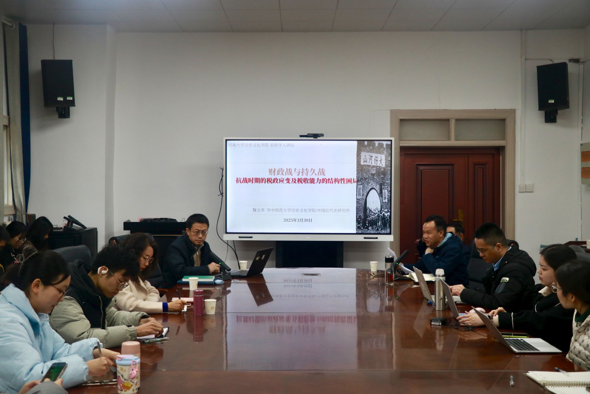 2025年3月30日上午,华中师范大学历史文化学院院长、中国近代史研究所教授、博士研究生导师魏文享受邀在河南大学历史文化学院三楼会议室做题为《财政战与持久战:抗战时期的税政应变及税收能力的结构性困局》的讲座,本场讲座由河南大学历史文化学院柳岳武教授主持。