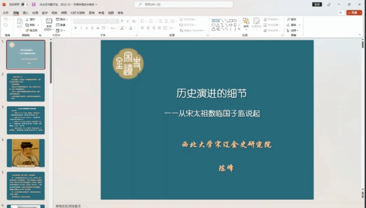 2022年12月4日晚,西北大学宋辽金史研究院院长暨历史学院教授、教育部长江学者特聘教授陈峰应邀在历史文化学院做题为《历史演进的细节——从宋太祖数临国子监说起》的线上讲座。本场讲座由河南大学历史文化学院王战扬副教授主持。
