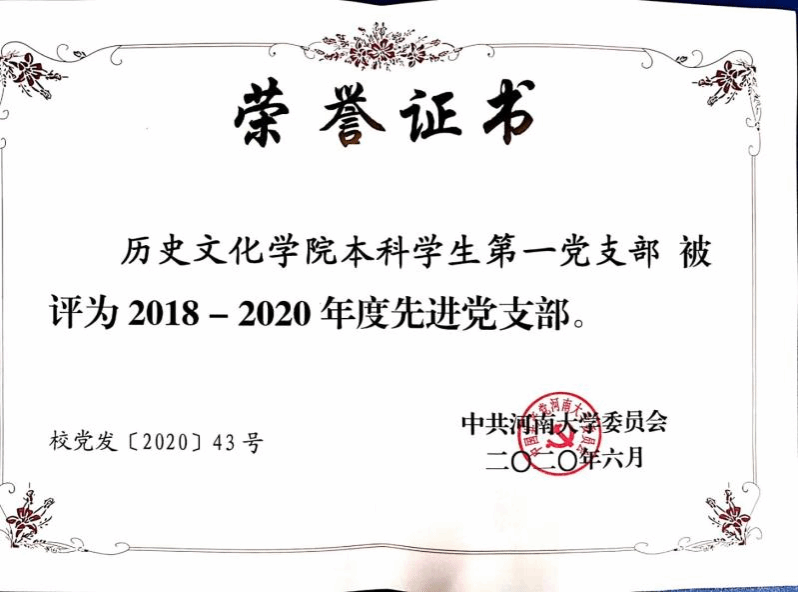 本科生第一党支部多名党员现任或曾任校院学生工作骨干,支部党员多次获“河南省大学生党员标兵”“中国大学生自强之星”“国家奖学金”“河南省三好学生”等荣誉称号,支部党员整体基本素质好、精神面貌好、人员分布多元。支部入选河南大学第三批党建工作样板支部培育创建单位,曾获“河南大学先进党支部(2018-2020年)”。