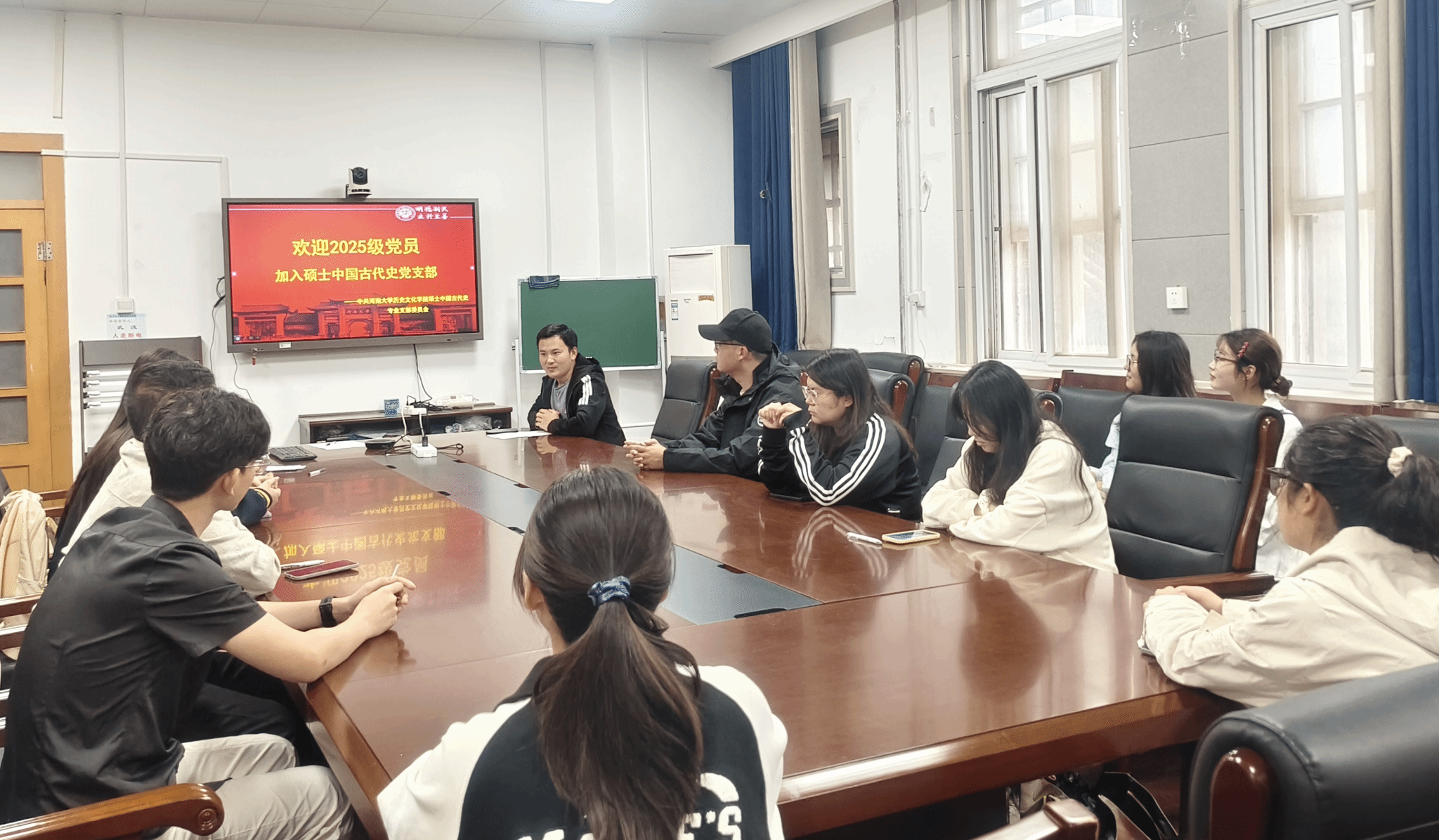 近日,历史文化学院硕士中国古代史专业党支部在古代史教研室召开党员大会,会议内容围绕欢迎2025级新生党员、廉洁警示教育、“历史典籍中的初心”读书分享以及参观“山河弦歌——抗战中的河南大学”图片展四个主题开展。