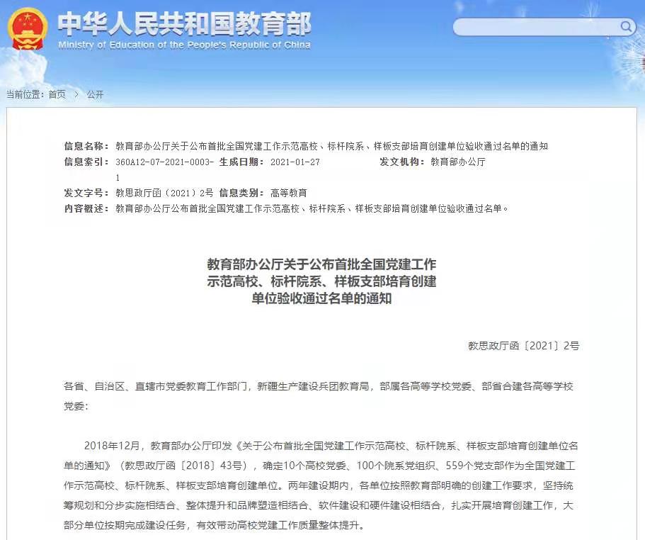 据悉,2018年12月,教育部共确定10个高校党委、100个院系党组织、559个党支部作为全国党建工作示范高校、标杆院系、样板支部培育创建单位。2020年10月以来,经创建单位对标自查总结、上级党组织满意度测评、属地党委教育工作部门把关复核、教育部思想政治工作司审查、教育部网站等公示,最终认定10个高校党委、98个院系党组织、551个党支部通过验收。