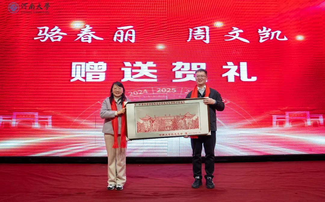 1984级毕业生赵耀荣向母校捐赠个人书画作品。洛阳市慈善艺术家吴大崴为参会人员送上亲笔书写的新春祝福。