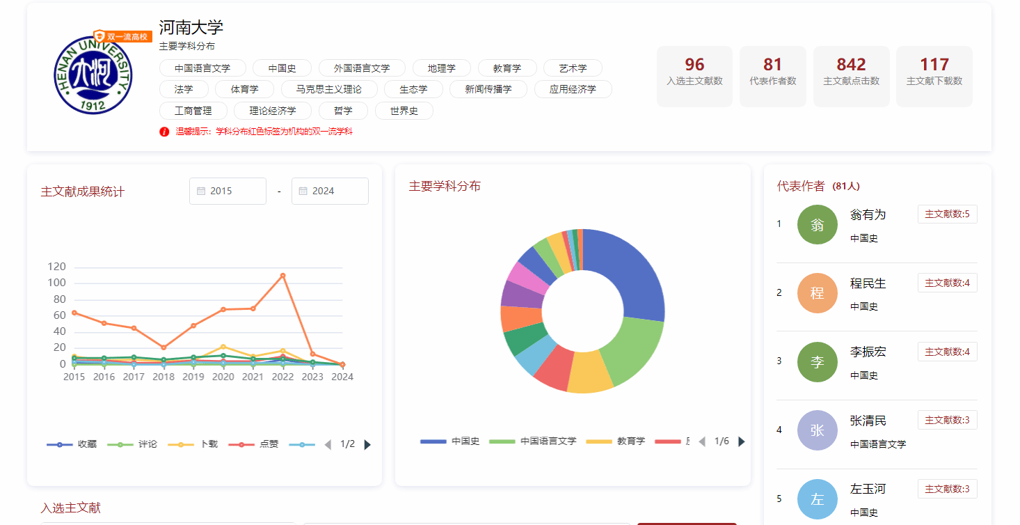 人文社科类共有96篇高水平文论入选全国哲学社会科学主文献(总发表数前0.5%的论文),其中中国史入选篇数最多,共26篇,世界史也有3篇入选。中国史共有13位学者入选,其中翁有为教授入选5篇,全校最多;程民生教授和李振宏教授各有4篇入选。哲学社会科学主文献平台(简称“哲社主文献”,//zszwx.cn)通过科学的遴选标准和学术共同体的专业评审,从海量文献中去粗取精、层层优选,遴选出约0.5%的主文献,具有极高的精选、传播与评价价值。新华社、人民日报、光明日报、中国社会科学报、中国教育电视台、科技日报等媒体评价“哲社主文献”是服务建构自主知识体系的一次尝试,将构筑开放包容的学术共同体,创造开放科学时代的学术交流新生态,引领数字文明时代的知识。我校中国史学科众多学者成果入选该平台,充分彰显了该学科在全国的学术影响力和认同度。