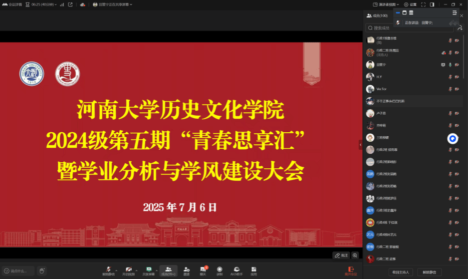 为深入了解学生学业进度与学习情况,推进历史文化学院学风建设,精准落实学业指导与帮扶工作,7月6日上午,历史文化学院2024级第五期“青春思享汇”暨学业分析与学风建设大会通过线上会议顺利举行。本次会议由2024级本科生辅导员田管宁主持,2024级全体学生参会。