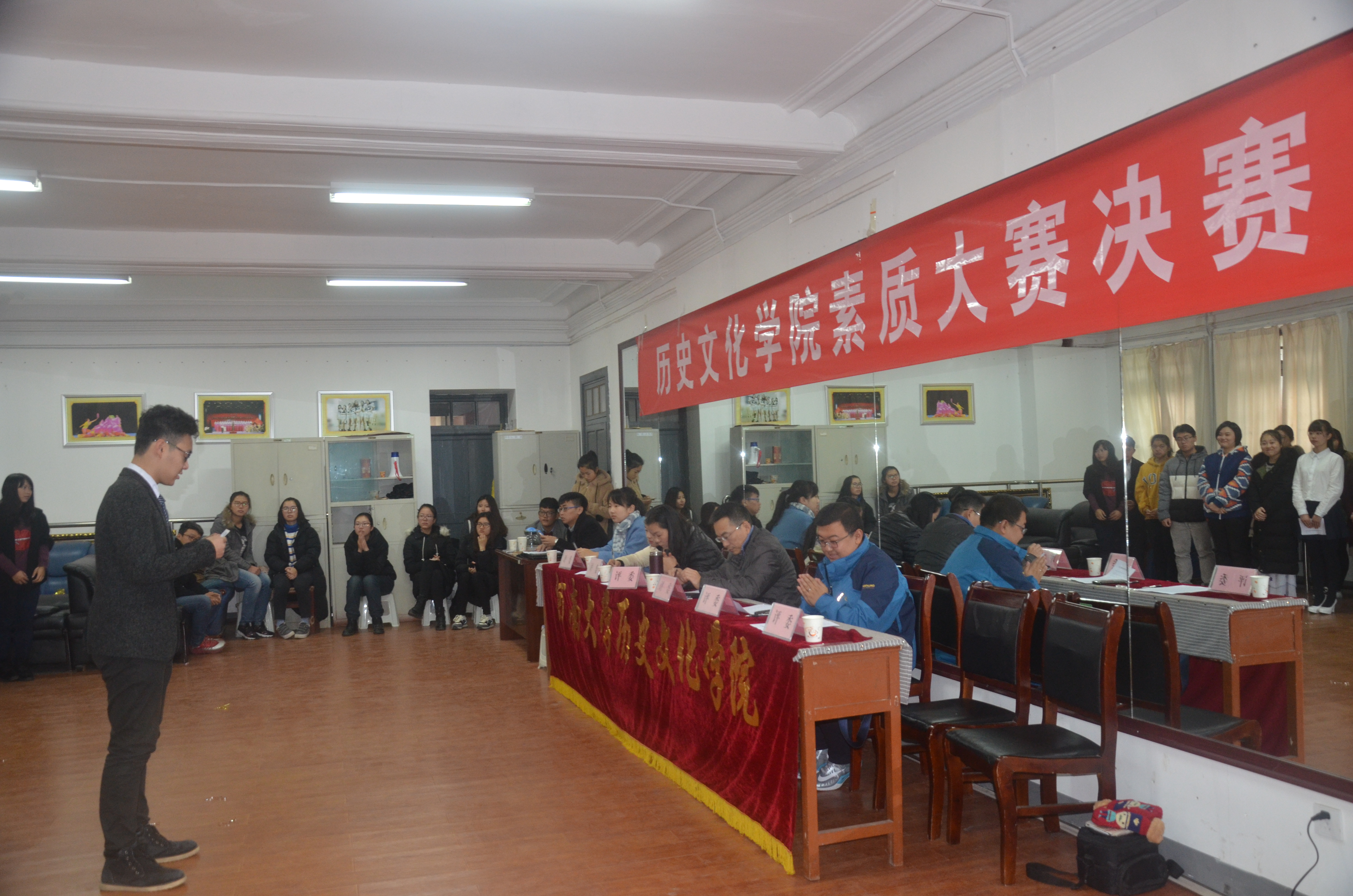 素质比拼展青春活力,多才多艺彰历院风采。11月27日上午,2016年历史文化学院素质大赛决赛在学院105排演厅隆重举行。院党委副书记杨光辉、院工会委员、旅游管理专业教师段冰、团委书记谢宇飞出席本次活动并担任评委。