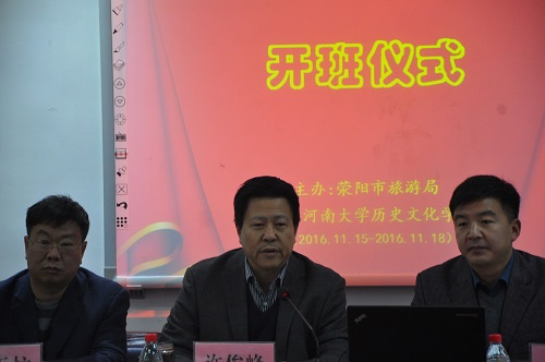 荥阳市副市长朱天柱首先表达了对历史文化学院的感谢,他说:河南大学是河南省的最高学府,师资力量雄厚,办学历史悠久,能来到这里学习感到十分荣幸。并针对此次培训提出了三点建议:一是思想上要高度重视,此次培训师资力量强大,授课老师长期从事旅游管理的研究和实践工作,对从业人员培训具有丰富的经验,在座学员要抓住机会,勤记笔记,做到不虚此行;二是要积极交流,相互学习,相互提高,抓住重点,重视实地化训练;三是要严格遵守各项培训纪律要求,为圆满完成各项培训任务、实现荥阳市旅游行政管理干部队伍素质整体提升提供保障。