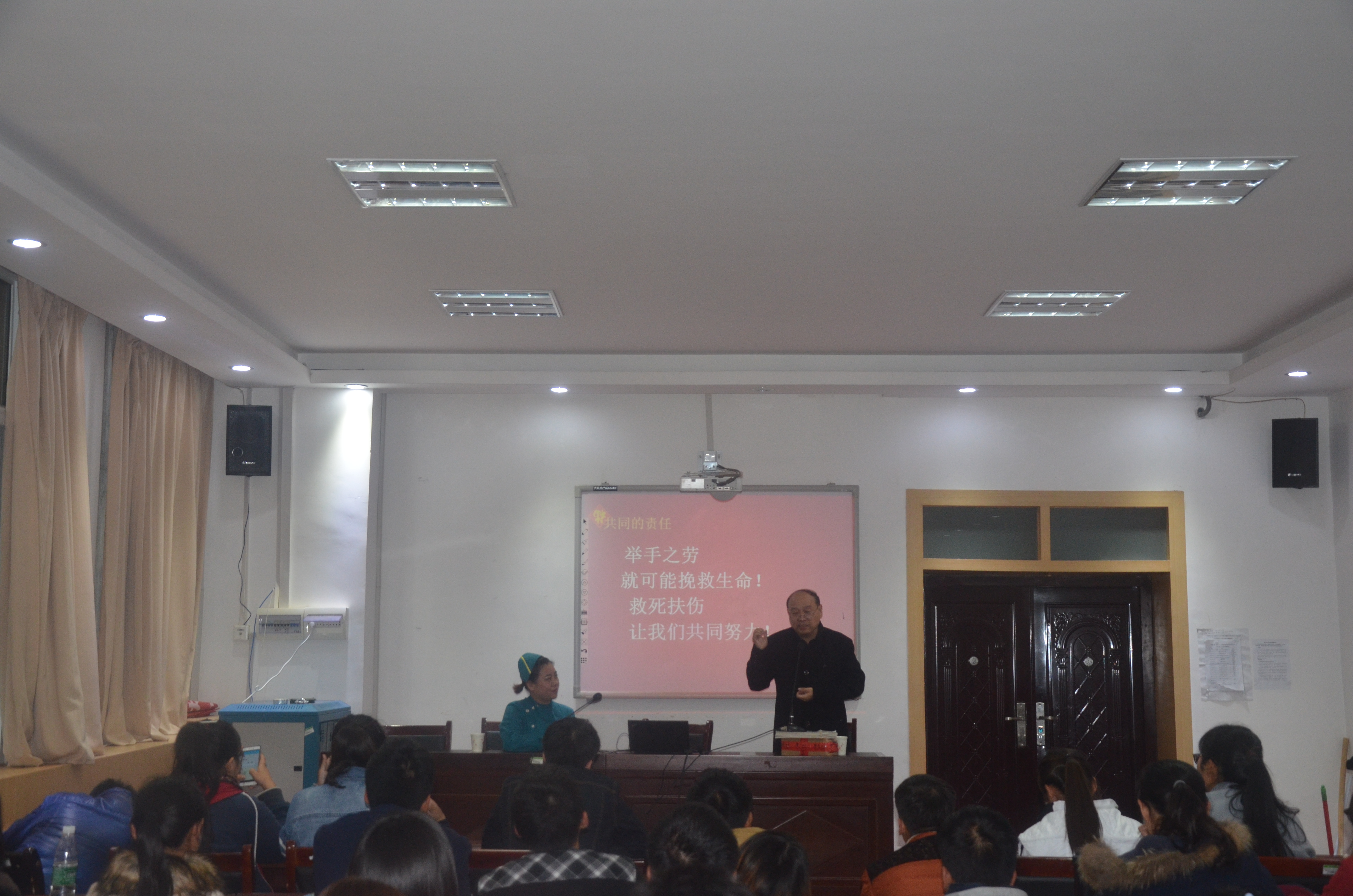 首先开封市中医院急诊科主任张胜强作急救知识培训讲解,一开始张主任并不急于介绍急救知识,而是从学生的角度向大家介绍了急救培训的重要性——在当前大学生活多元化的背景下,同学们经常参加各类活动,掌握一定的急救技能就显得尤为重要。张主任先就“心肺复苏”的概念作了解释,他表示我国每年有超过45万人死于心源性猝死,“心肺复苏”的急救技能不仅是出于其重要性、更出于其迫切性。他向同学们介绍了心脏骤停的定义,以及心脏骤停后各个阶段的人体反应。最后,张胜强主任以“有时,去治愈;常常,去帮助;总是,去安慰。”作为结语,希望同学们能够掌握急救知识及技能,爱护生命,健康成长。