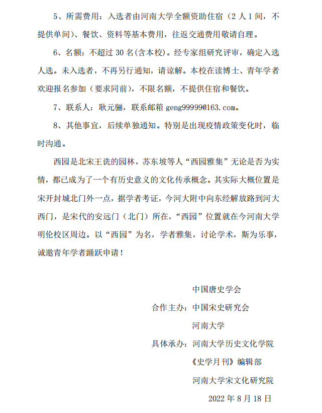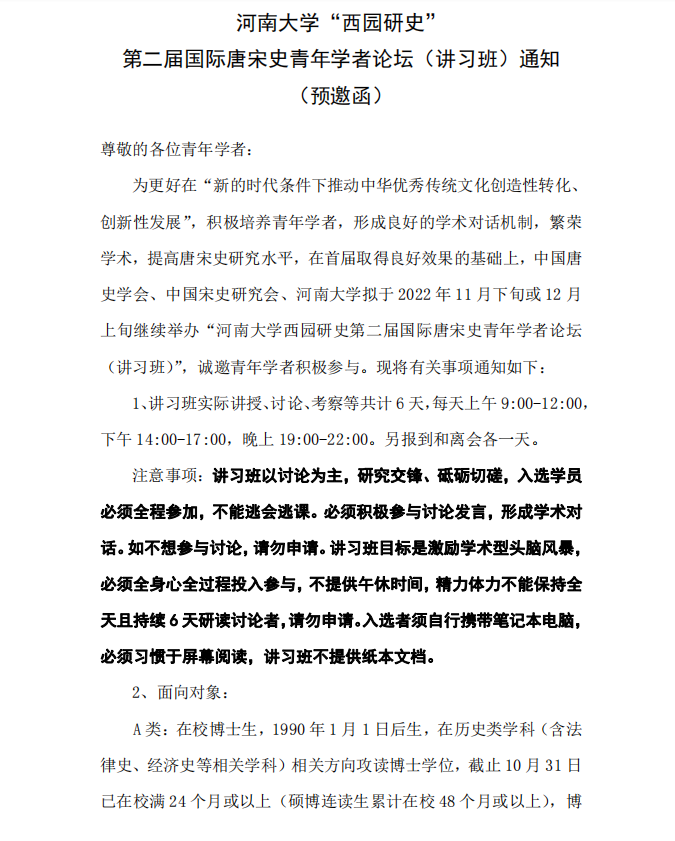 河南大学“西园研史” 第二届国际唐宋史青年学者论坛(讲习班)通知 (预邀函)