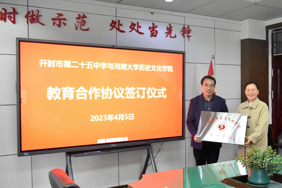 祁琛云和张海英分别代表河南大学历史文化学院和开封二十五中签订了教育合作协议,并共同为河南大学历史文化学院实习基地揭牌;随后,刘坚回顾了十多年来该校和河南大学历史文化学院合作的渊源,并请双方代表讲话;张海英代表该校对河南大学历史文化学院的来宾表示欢迎,感谢河南大学为该校的发展输入新鲜力量,作为实习基地,我们会与河大一道,为培养合格的师范生而努力,也希望河南大学在教学理论方面给予我们指导,让我们携手实现实践和理论的互相促进,共同进步;祁琛云在讲话中指出这次签约活动是一种深化合作的契机,感谢张校长和各位老师的支持与帮助,未来我们将通过资源共享等方式在高考研究、师范生培养、学科基地建设和教育理论研究等方面深入合作。