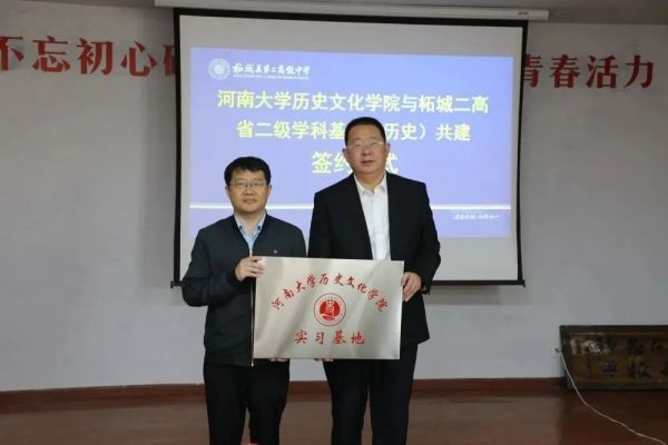 为加速高校教学育人方式改革,推动学校多样化特色化发展,促使高等教育与基础教育互融共进,5月24日,河南大学历史文化学院举行我院与柘城县第二高级中学省二级学科基地(历史)共建签约活动。