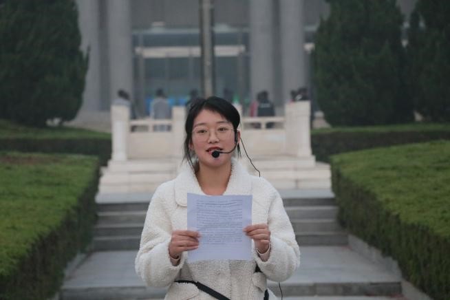 升旗仪式结束后,历史文化学院团委副书记郑振亚发言。他表示,国旗是新中国的象征,国歌是最激越的旋律,现如今幸福祥和的生活正是英雄前辈浴血奋战的结果。他强调,祖国取得的辉煌成就来之不易,作为河大学子,在中华民族伟大复兴的征程中,应当用实际行动书写当代大学生的正确价值观,为祖国的发展贡献青春力量。2020级世界史专业学生代表文曲星作国旗下演讲。她举出独龙族的实例,阐明了中国共产党始终秉持“一个民族都不能少”的原则,带领各少数民族不断发展迈向小康的初心,河大学子作为新时代青年,更应传承百折不挠、自强不息的精神,为实现中华民族的伟大复兴而拼搏奋斗。