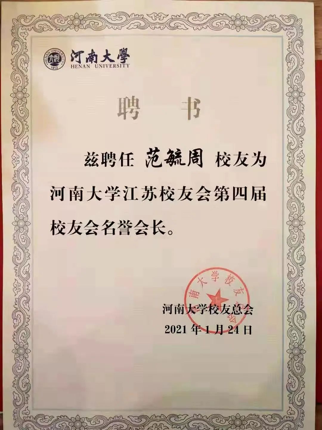 我从欧美各个名校讲学和研究回国后,母校对我恩惠愈深。为了报答母校恩惠,我和原在河南大学任教多年后任河海大学校长的国家著名水利专家严凯教授在南京组织散在江苏各地的河南大学校友建立了南京校友会,由严凯教授任会长,我任副会长。后来严凯教授退休由我接任会长,开展了一系列校友联谊活动,母校校友总会给予多方支持和指导,使这个不足百人的校友会成为江苏校友与母校联系的纽带。我们先后组织校友参加了母校建校90周年和100周年校庆的活动。在此期间母校历史文化学院还聘我为兼职教授回母校做过多次学术报告,汇报自己在科研方面的收获。学校领导黄校长还亲自到南京大学看望我,并由学校娄源功校长亲自聘请我与我的老师夏商周断代工程首席科学家李学勤教授及中国社会科学院历史研究所副所长王震中教授、中国社会科学院考古研究所所长王巍教授同时担任学校的校聘“讲座教授”。在母校建校100周年校庆活动中,由我提议并参与组织历史文化学院专门举办的“纪念孙作云教授诞辰100周年国际学术研讨会”作为校庆重要活动。此后我受主持“协同创新”项目“黄河文明与可持续发展”的学校党委书记关爱和教授邀请参与该项目的顶层设计,还在西二斋为我设立了专门的办公室。在该项目进行过程中我参加了多次专门学术会议和活动外,还广泛邀请海外学者帮助母校组织了“黄河文明与古文字国际学术研讨会”。