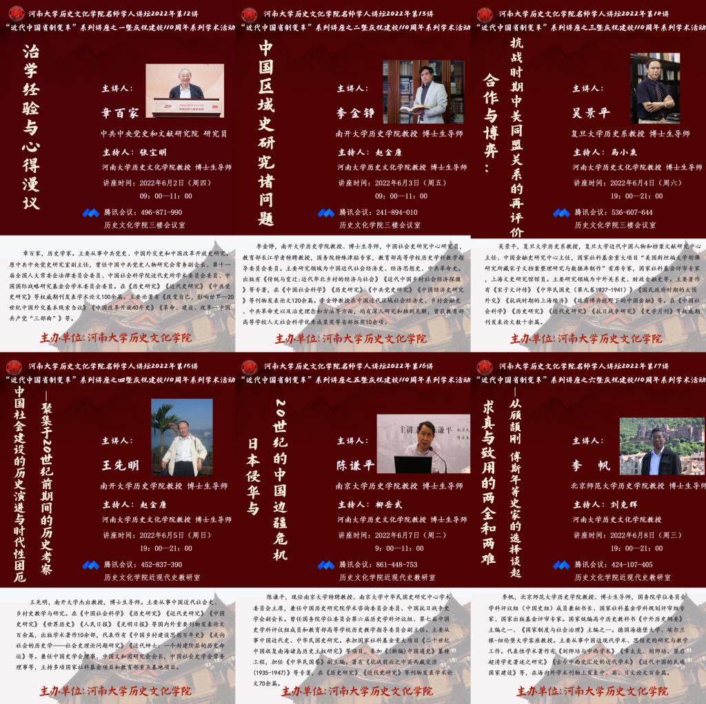 6月2日至6月8日,河南大学历史文化学院成功举办“近代中国省制变革”系列讲座暨庆祝建校110周年系列学术活动。中共中央党史和文献研究院研究员章百家、南开大学历史学院教授和博士生导师李金铮、复旦大学历史系教授和博士生导师吴景平、南开大学历史学院教授和博士生导师王先明、南京大学历史学院教授和博士生导师陈谦平、北京师范大学历史学院教授和博士生导师李帆分别应邀以线上线下相结合的方式作专题讲座。