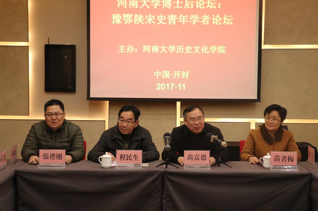 11月25日上午,由河南大学历史文化学院主办的河南大学博士后论坛:豫鄂陕宋史青年学者论坛在新东苑大酒店举办。河南大学人事处处长尚富德教授,历史文化学院院长苗书梅教授、河南大学中国古代史研究中心主任程民生教授出席论坛,来自武汉大学、西北大学、华中师范大学、厦门大学、郑州大学、河南大学等16所高校的30余位学者参加本次论坛。
