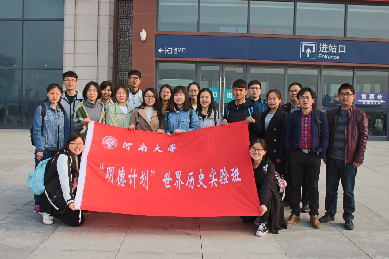 4月12日,在张礼刚、胡浩、卢镇、孙银刚和梅祖蓉老师的带领下,“明德计划”世界历史实验班正式前往北京,同首都师范大学、中国人民大学世界史专业的师生进行交流。清晨7点,旭日初生,北上交流的师生们在开封北站前集中,用他们的专属旗帜,记录下了赴京的第一个脚印。4个多小时的旅途后,一行人顺利抵达首都师范大学。简单的午饭后,实验班成员在老师的带领下兵分两路——国家图书馆和国家博物馆。