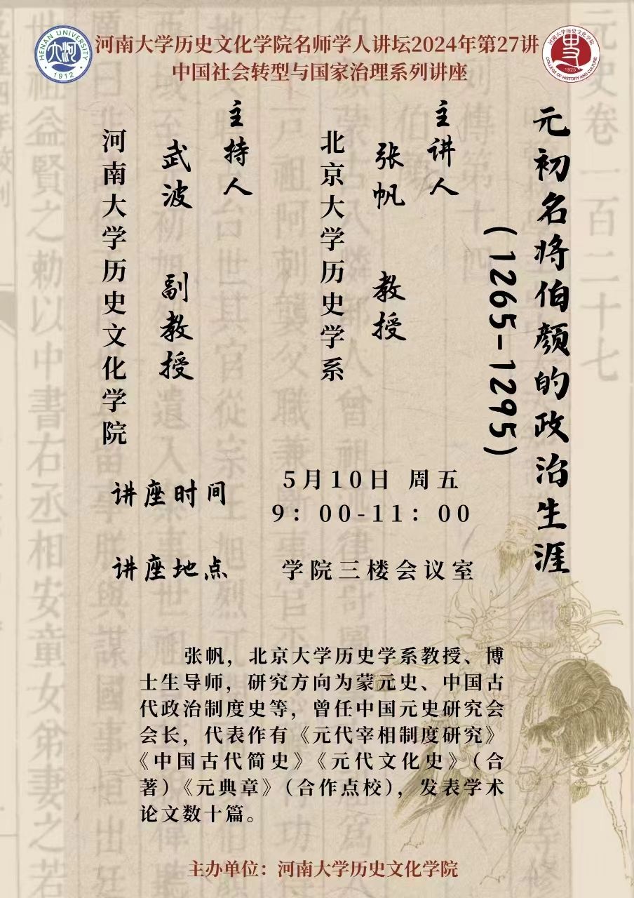 【讲座通知】张帆:元初名将伯颜的政治生涯(1265-1295)
