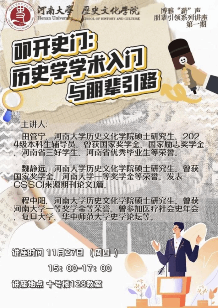 为深入贯彻落实立德树人根本任务,营造我院浓厚学术氛围,构建互帮互助、教学相长的优良学风,充分发挥优秀学子的示范引领作用,河南大学历史文化学院精心推出博雅“薪”声朋辈引领系列讲座活动,希望通过朋辈间平等交流氛围可以有效打破沟通壁垒,为广大青年学子学业进步、能力提升与价值塑造注入温暖而坚实的力量。