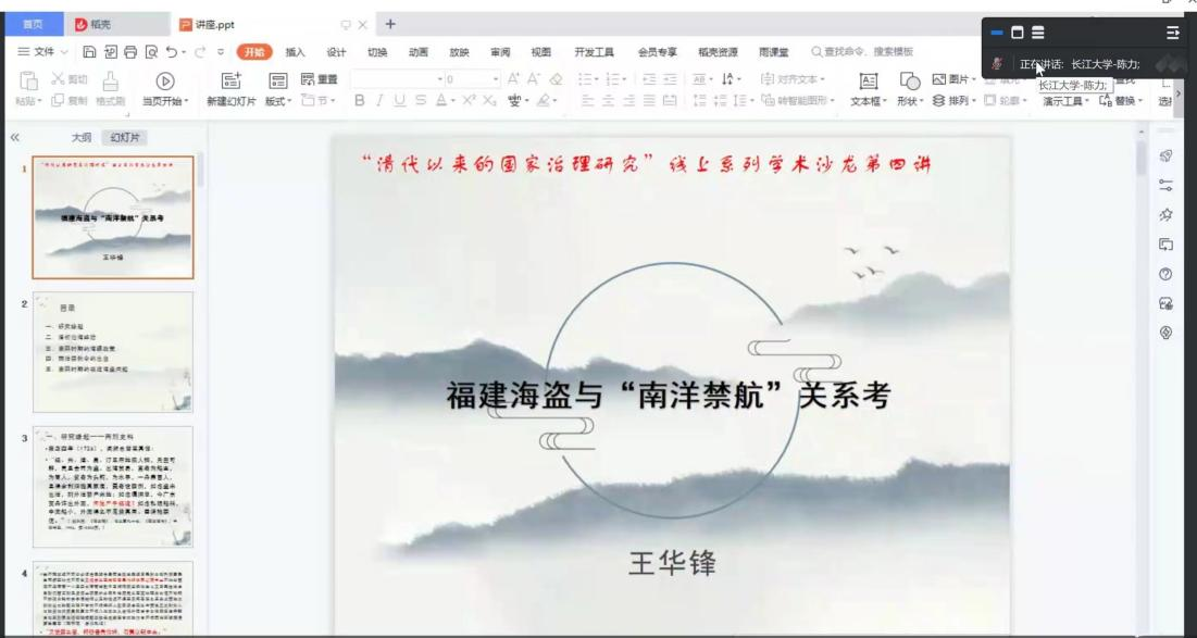 2023年8月12日晚上,北京师范大学(珠海)人文和社会科学高等研究院王华锋教授做题为《福建海盗与“南洋禁航”关系考》的线上讲座。本场讲座由长江大学历史系陈力教授主持,泰山学院历史系张波副教授、河南大学历史文化学院贺怀锴副教授作为与谈人参加会议。