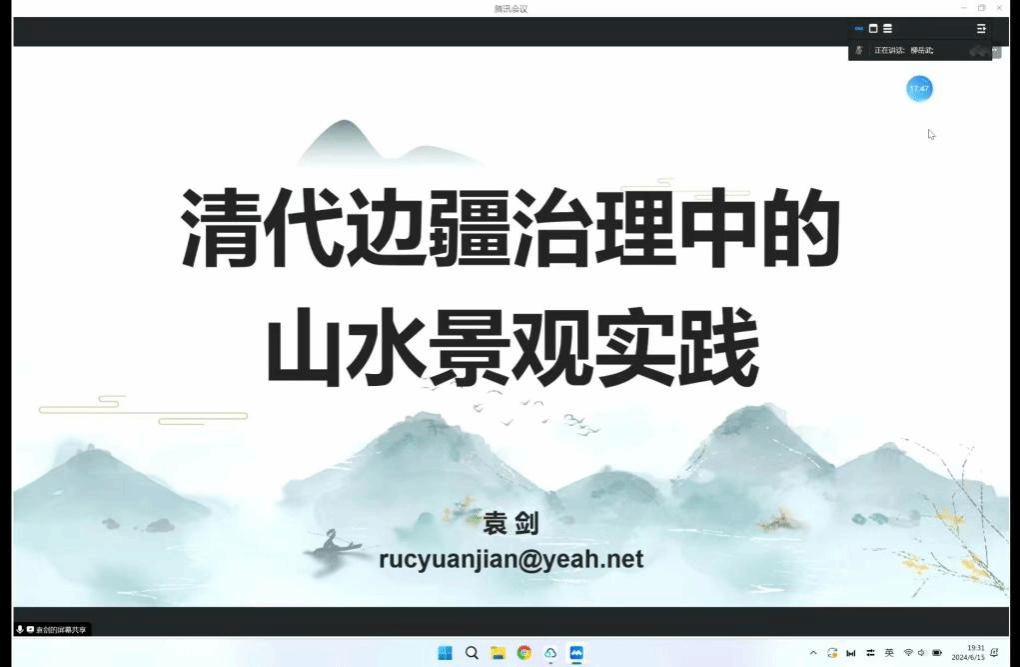 2024年6月15日晚上,中央民族大学民族学与社会学学院袁剑教授在河南大学历史文化学院做题为《清代边境治理中的山水景观实践》的线上学术沙龙,本次讲座由河南大学历史文化学院柳岳武教授主持,泰山学院历史文化学院张波副教授和河南大学历史文化学院贺怀锴副教授作为与谈人参与会议。